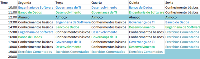 Por fim, o cronograma apresentado reflete a minha realidade, mas nem sempre consigo cumprir ele a risca, tendo em vista as reuniões do dia a dia, Mestrado, Esposa, etc. Mas é fundamental que você tenha um planejamento que te force a segui-lo.